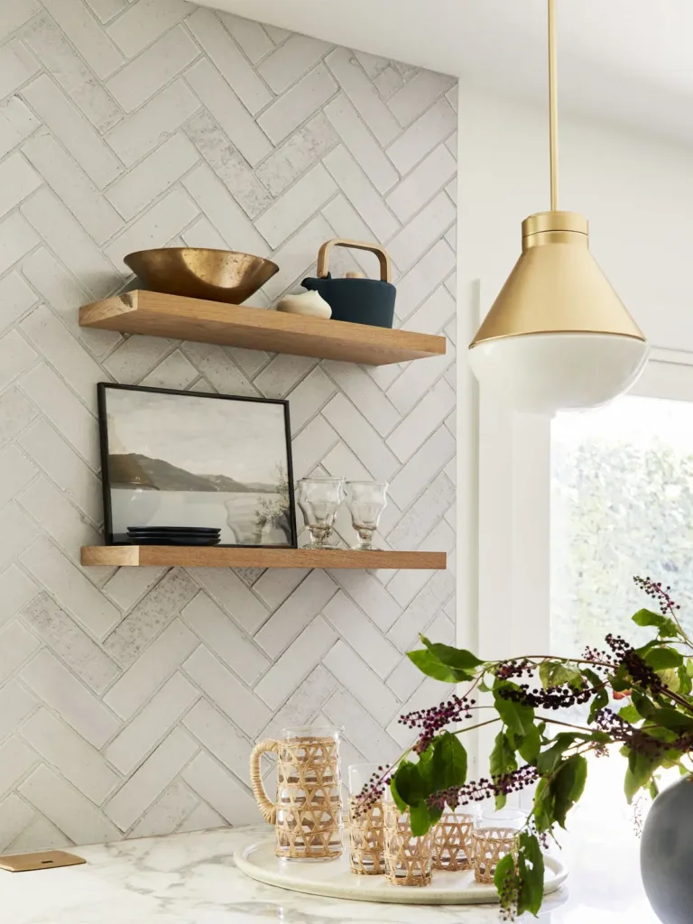 Glass tiles reflect light, making your kitchen feel larger and brighter. They’re available in endless shades, from soft seafoam to dramatic navy, giving you lots of room for creativity.