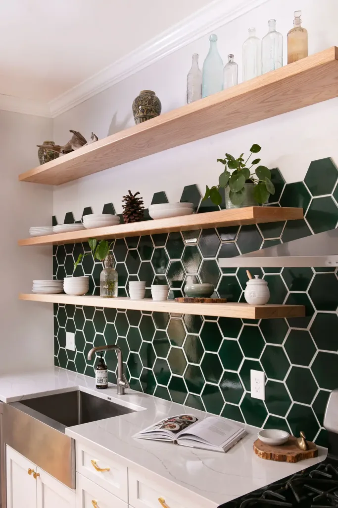 They’re fantastic for creating a focal point behind the stove or sink. If you love modern-meets-fun kitchens, hexagons are the perfect fit.