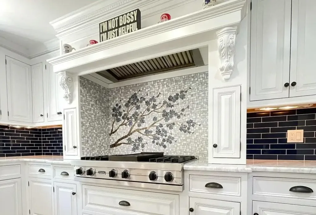 For a showstopping centerpiece, consider a mosaic mural backsplash. These can depict florals, abstract art, or scenic designs.