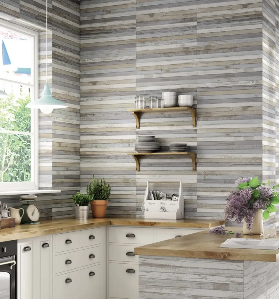 Love farmhouse style? A shiplap-inspired backsplash done in tile offers the rustic charm without the upkeep of wood.