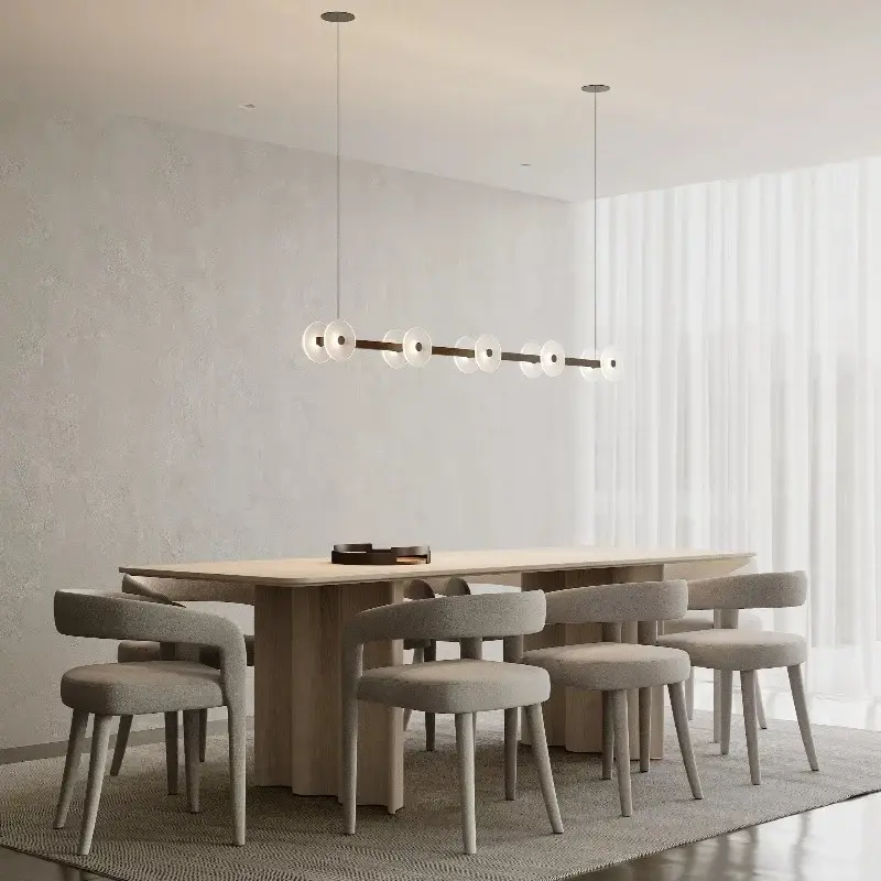 Linear pendants with metallic finishes and frosted glass panels are perfect for kitchen islands or long dining tables. Their streamlined look is pure Deco with a modern twist.