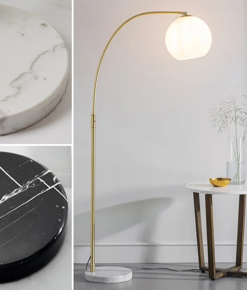 Tall floor lamps with curved or angular arms work best for living rooms or offices. Position one beside a velvet armchair to create an instant cozy reading corner with dramatic style. Bonus: marble finishes blend seamlessly into both modern and vintage-inspired interiors.