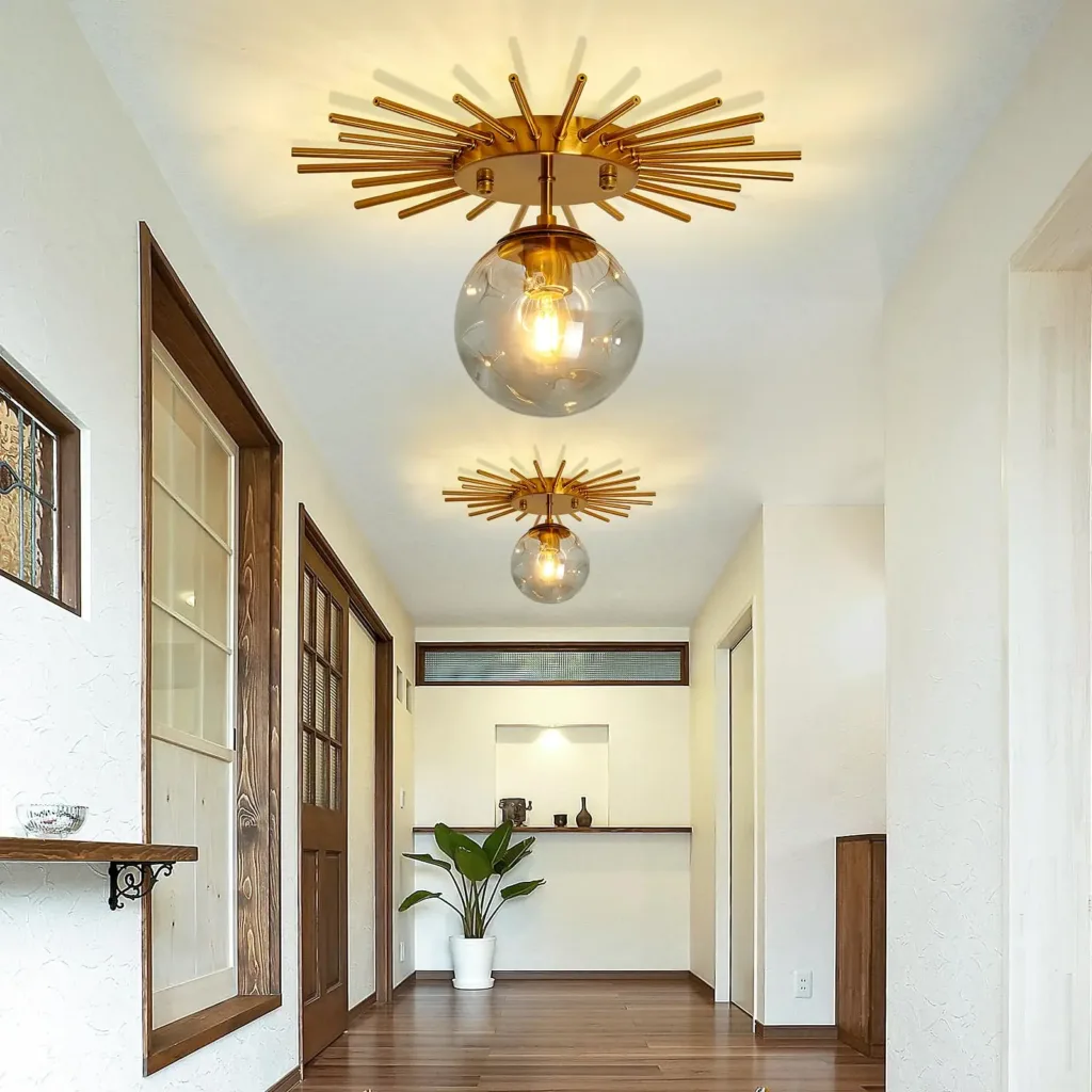 Choose one with gold or bronze arms extending from a central bulb. It works wonderfully in entryways where you want a striking first impression. For smaller rooms, a flush-mount sunburst fixture provides both charm and function without overwhelming the ceiling height.