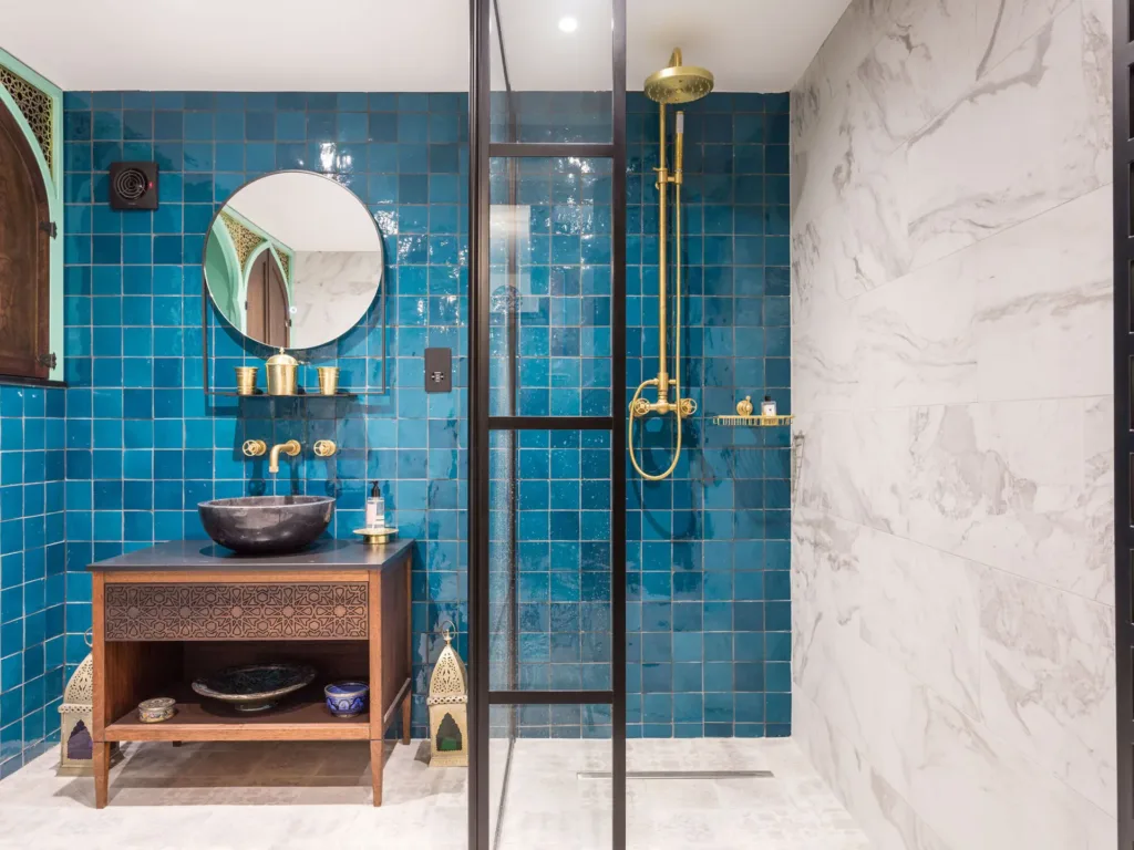 For those who love exotic and bohemian vibes, Moroccan-style patterned tiles in shades of blue are an excellent choice. These tiles typically feature geometric or floral motifs that instantly transport you to a Mediterranean spa.