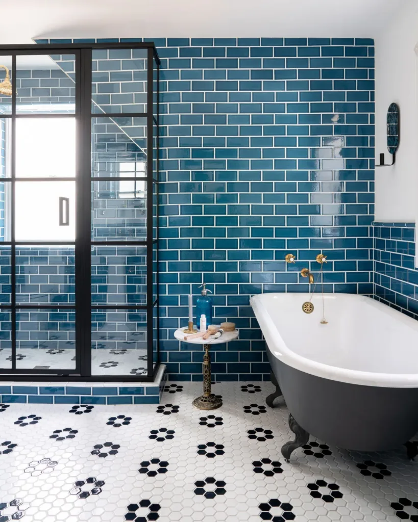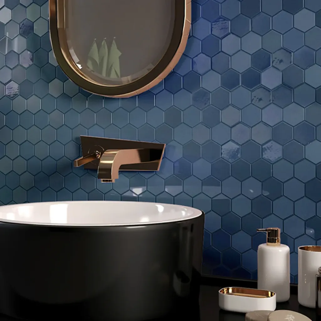 Hexagon tiles are always trendy, and in blue they become an instant eye-catcher. Use them on floors, shower walls, or even as a feature behind your sink. Larger hexagons create a modern look, while smaller ones feel playful and intricate.