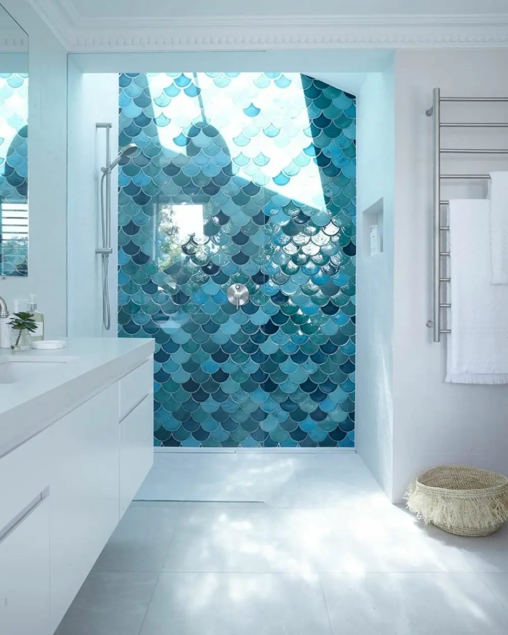 Fish scale (or mermaid) tiles are whimsical and stylish. In gradient shades of blue, they mimic ocean waves, making them perfect for a coastal or spa-inspired bathroom.