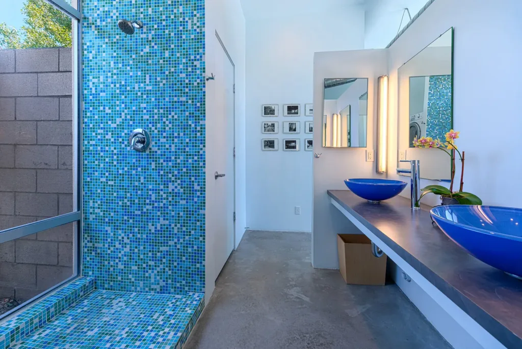 - Consider lighting carefully — glossy blue tiles sparkle under good light.