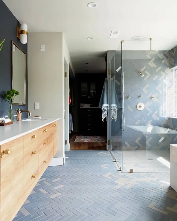 This idea works wonderfully in smaller bathrooms because it makes the floor appear wider and more dynamic. Pair with white walls for a crisp look, or add a navy vanity for subtle contrast. A pale blue herringbone floor is an easy way to create charm without overpowering the space.