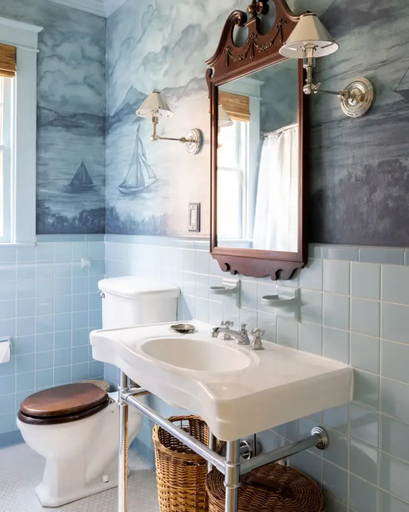 This look feels nostalgic yet refreshing when balanced with modern touches like updated lighting or patterned floor tiles. Powder blue pairs beautifully with floral wallpaper or patterned curtains for a cozy, homelike feel.