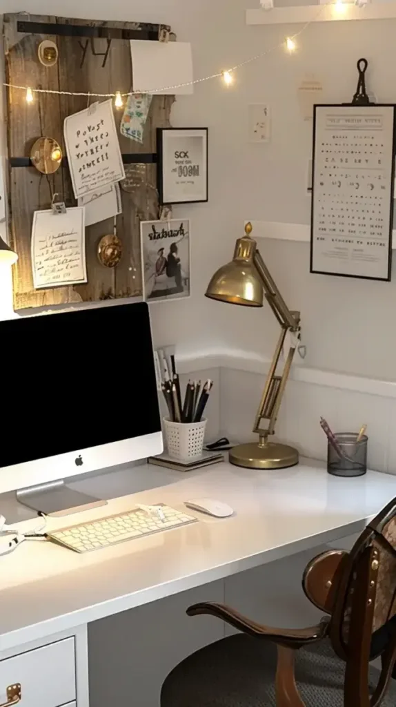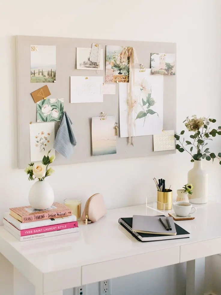 Pinboards aren’t just for reminders — they can be styled beautifully. Cover yours in linen fabric and use gold or wooden pins. Mix functional notes with pretty postcards, fabric swatches, or mini mood boards.