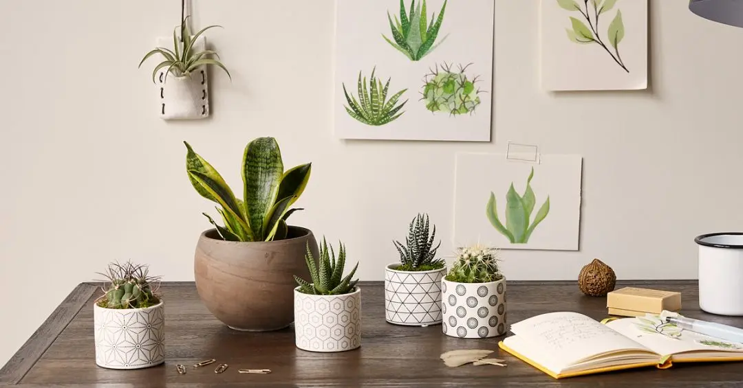 - Mix plant sizes — one large statement plant plus smaller desk plants creates balance.