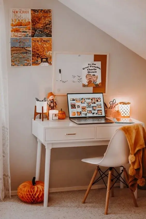 Rotating small décor keeps your desk exciting. Think pumpkins in fall, fairy lights in winter, or pastel flowers in spring.
