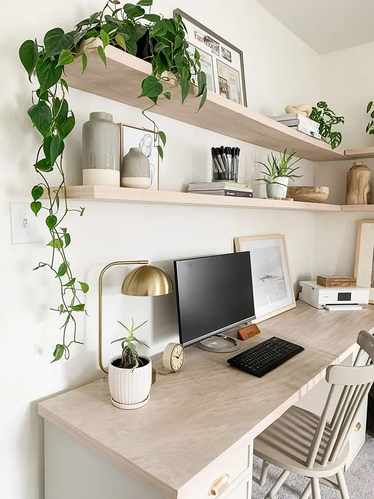 When desk space is limited, think vertically. Floating shelves provide storage without cluttering your work surface. Use them to hold books, plants, or decorative baskets.