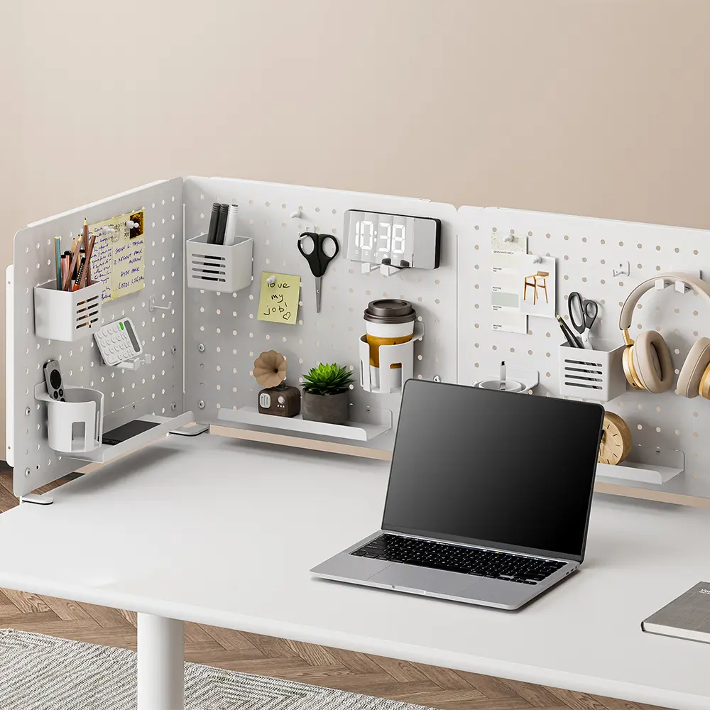 Pegboards are functional yet stylish. They free up desk space while offering customizable storage. Use hooks for headphones, baskets for pens, or mini shelves for décor.