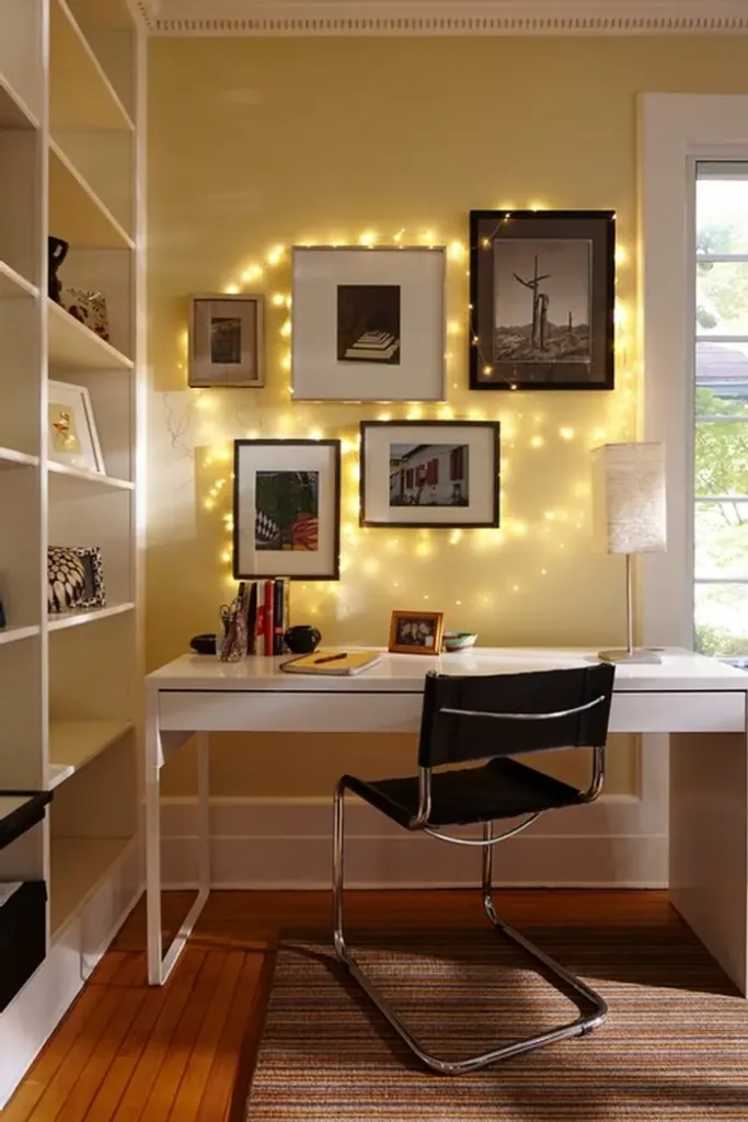 String lights aren’t just for bedrooms—they bring instant charm to small offices. Drape them across shelves, around bulletin boards, or along the wall.